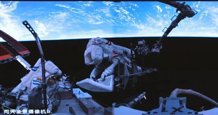 这是2025年6月26日在北京航天飞行控制中心屏幕上拍摄的神舟二十号航天员陈冬(左)与陈中瑞在空间站组合体舱外工作的画面。新华社发(周柯毅 摄)